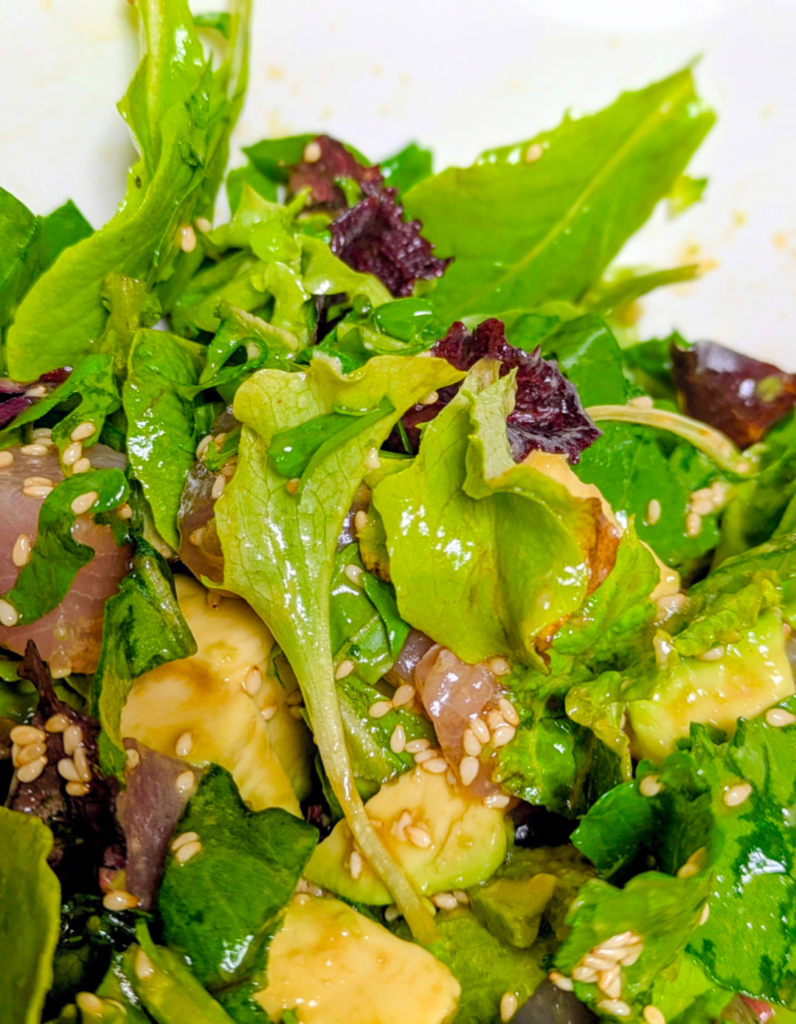 大関さん(主人)はネギ類が苦手なので、薬味は胡麻のような香りとピリッとした辛味があるルッコラで代用したところ、とても喜ばれました!