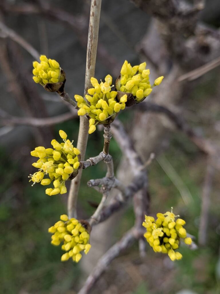 家の庭では、「サンシュユ」が咲き始めました。