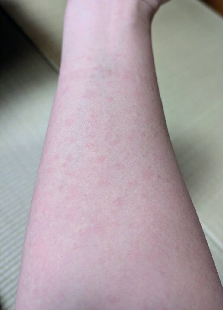 慌ててお風呂を出て全身を確認すると、両腕の内側、背中、お尻に蕁麻疹のような発疹が広がっていたのです。